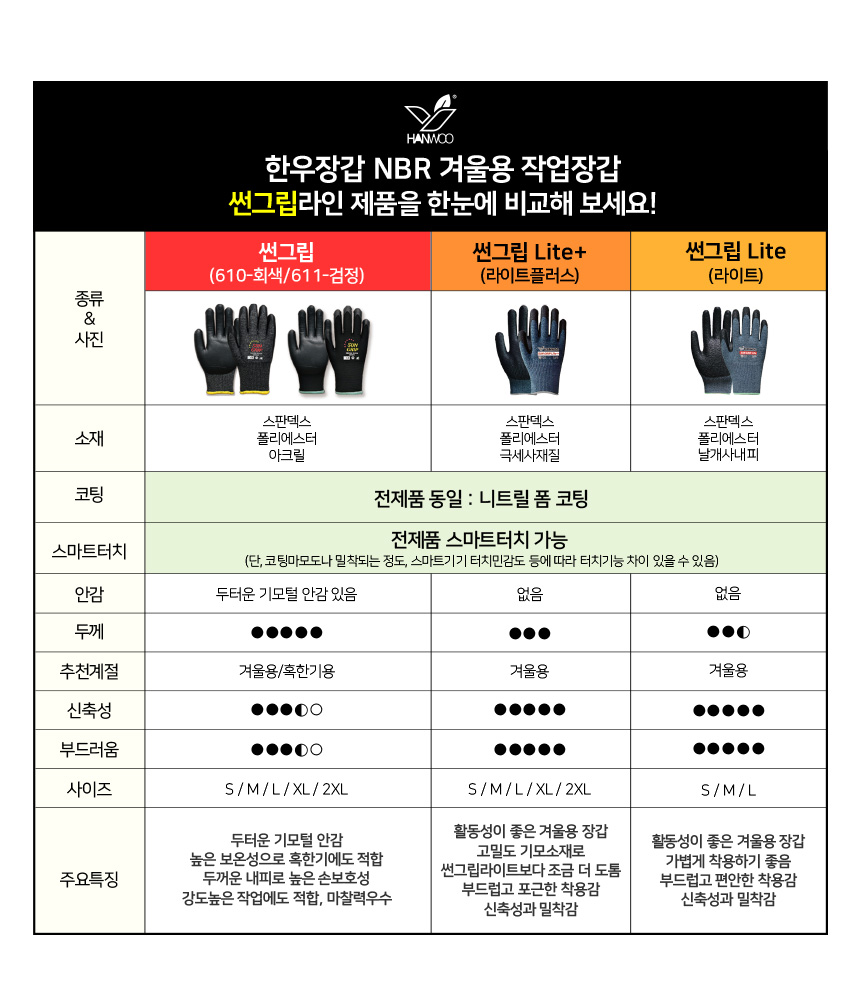 한우장갑의 NBR장갑 제품류의 비교표를 우선 참고해주시면 감사하겠습니다.